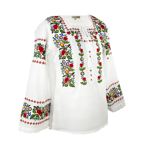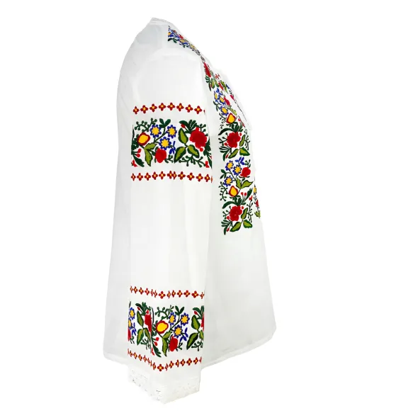 Bluza tip ie alba din bumbac cu maneca lunga si motiv floral multicolor.
