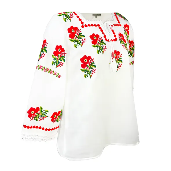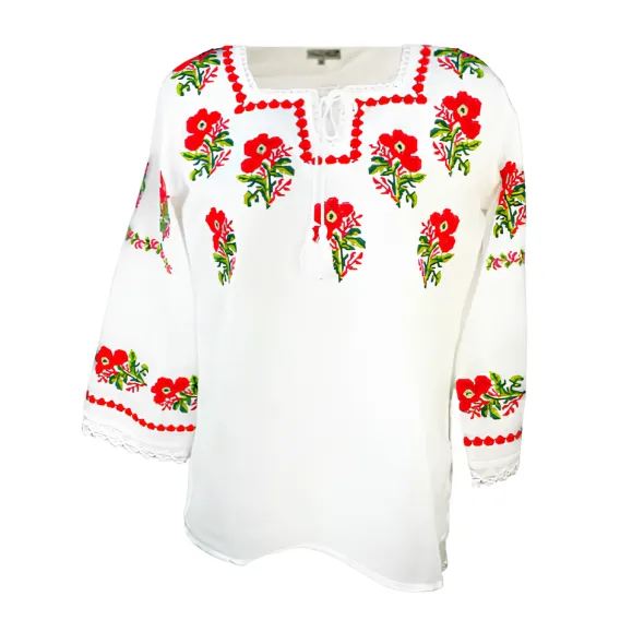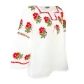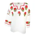 Bluza tip ie alba din bumbac cu maneca 3/4 si motiv floral rosu.