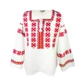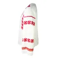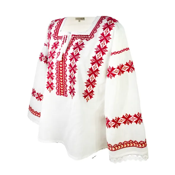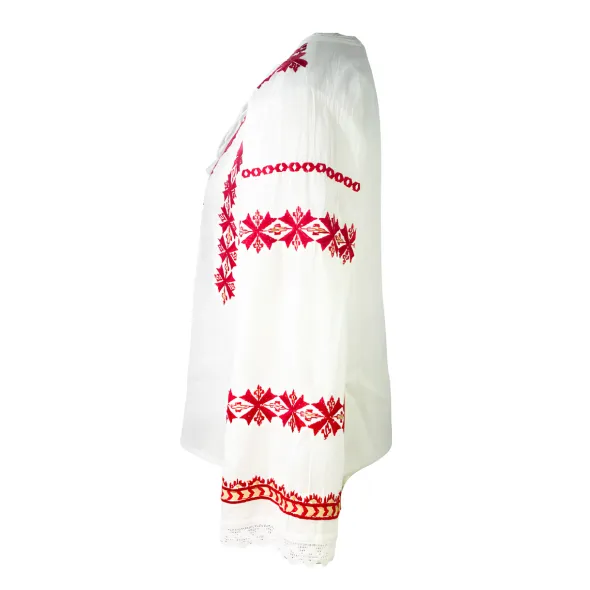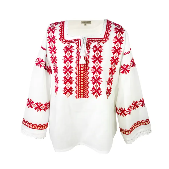 Bluza tip ie alba din bumbac cu maneca lunga si motiv geometric rosu.