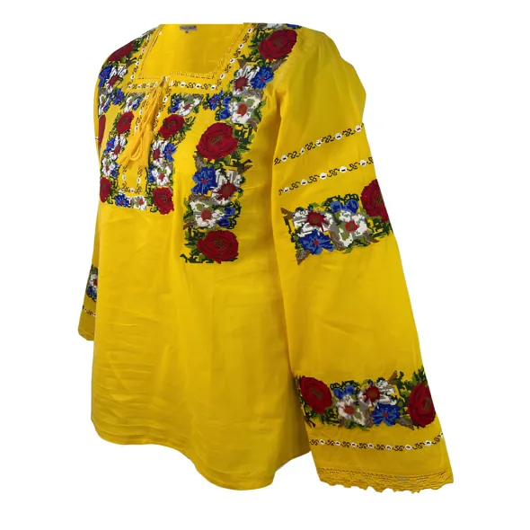 Bluza tip ie galbena din bumbac cu maneca lunga si motiv floral multicolor.