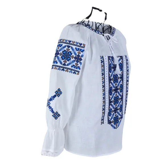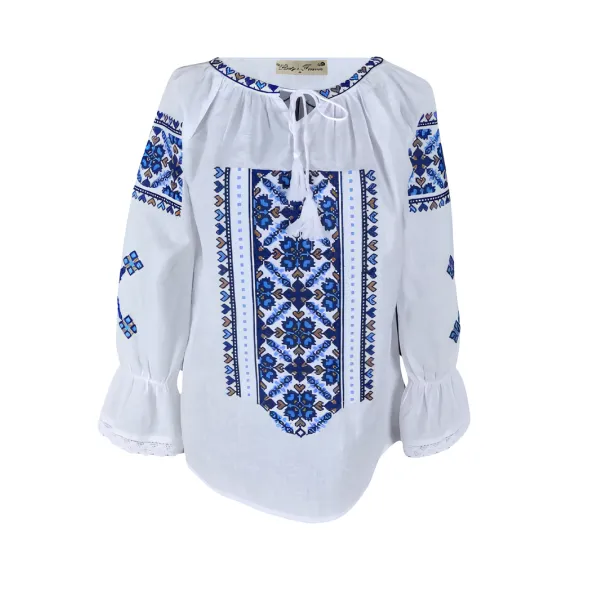 Bluza Tip Ie Alba cu Motiv Floral Albastru