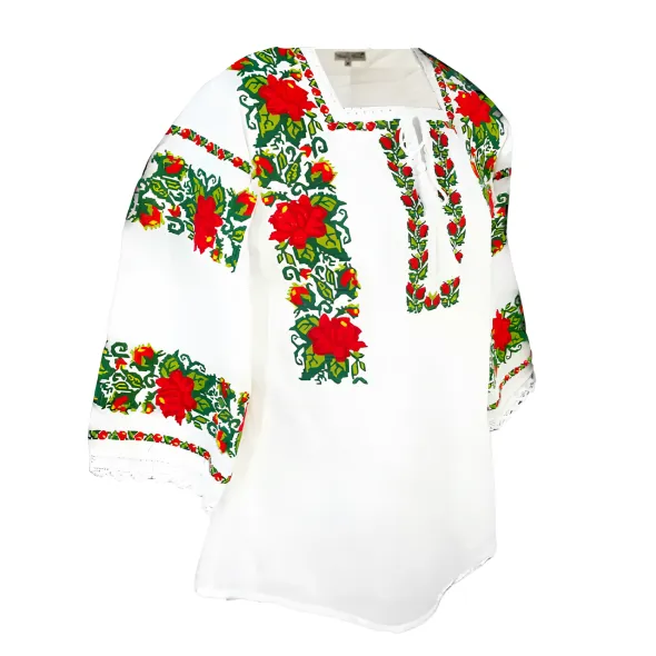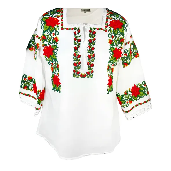 Bluza Tip Ie Alba cu Motiv Floral Rosu