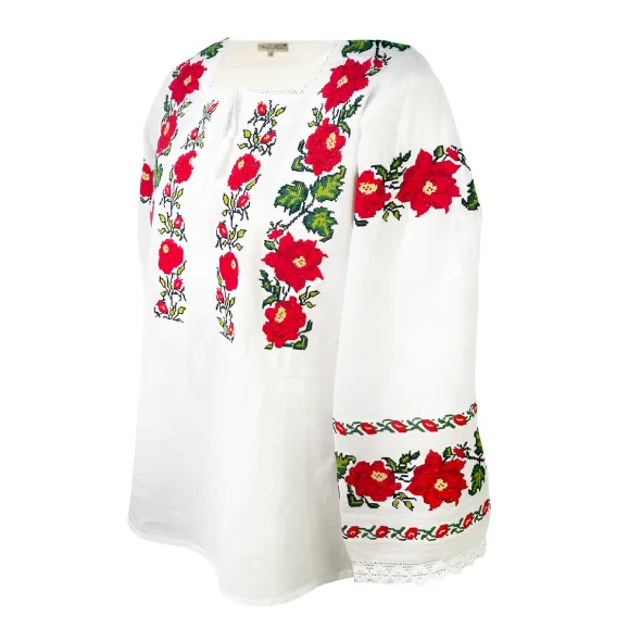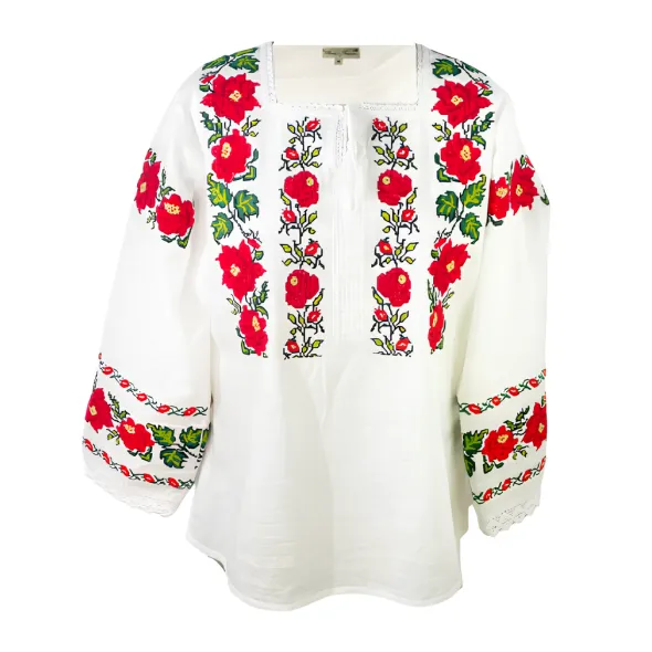 Bluza Tip Ie Alba cu Motiv Floral Rosu