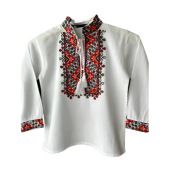 Camasa traditionala de baieti alba cu motiv floral rosu