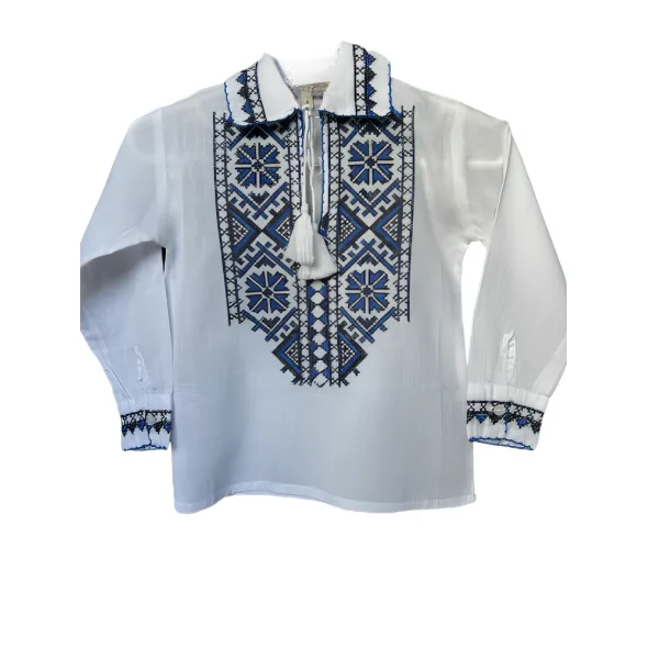 Camasa traditionala de baieti alba cu motiv geometric albastru