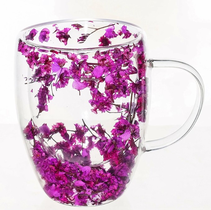 Cana din sticla borosilicata pereti dubli 350ml flori uscate mov- INV02