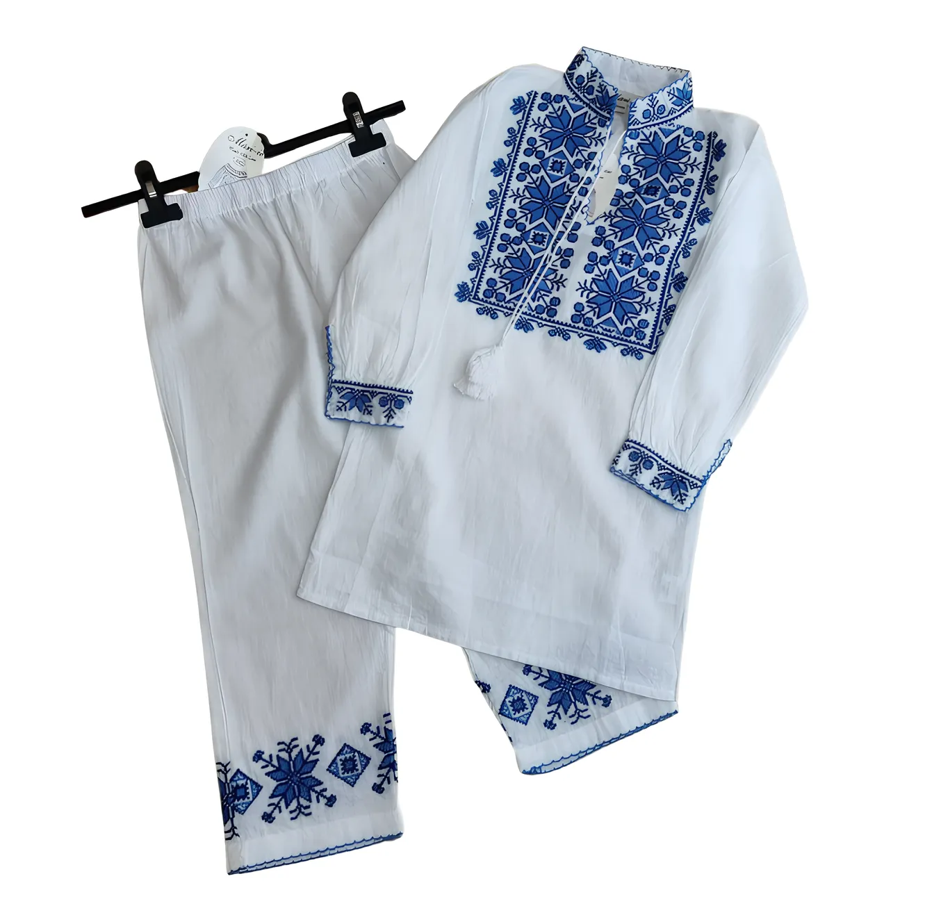 Compleu Traditional Alb pentru Baieti cu Motiv Geometric Albastru