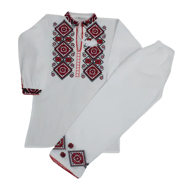 Compleu Traditional Alb pentru Baieti cu Motiv Geometric Albastru