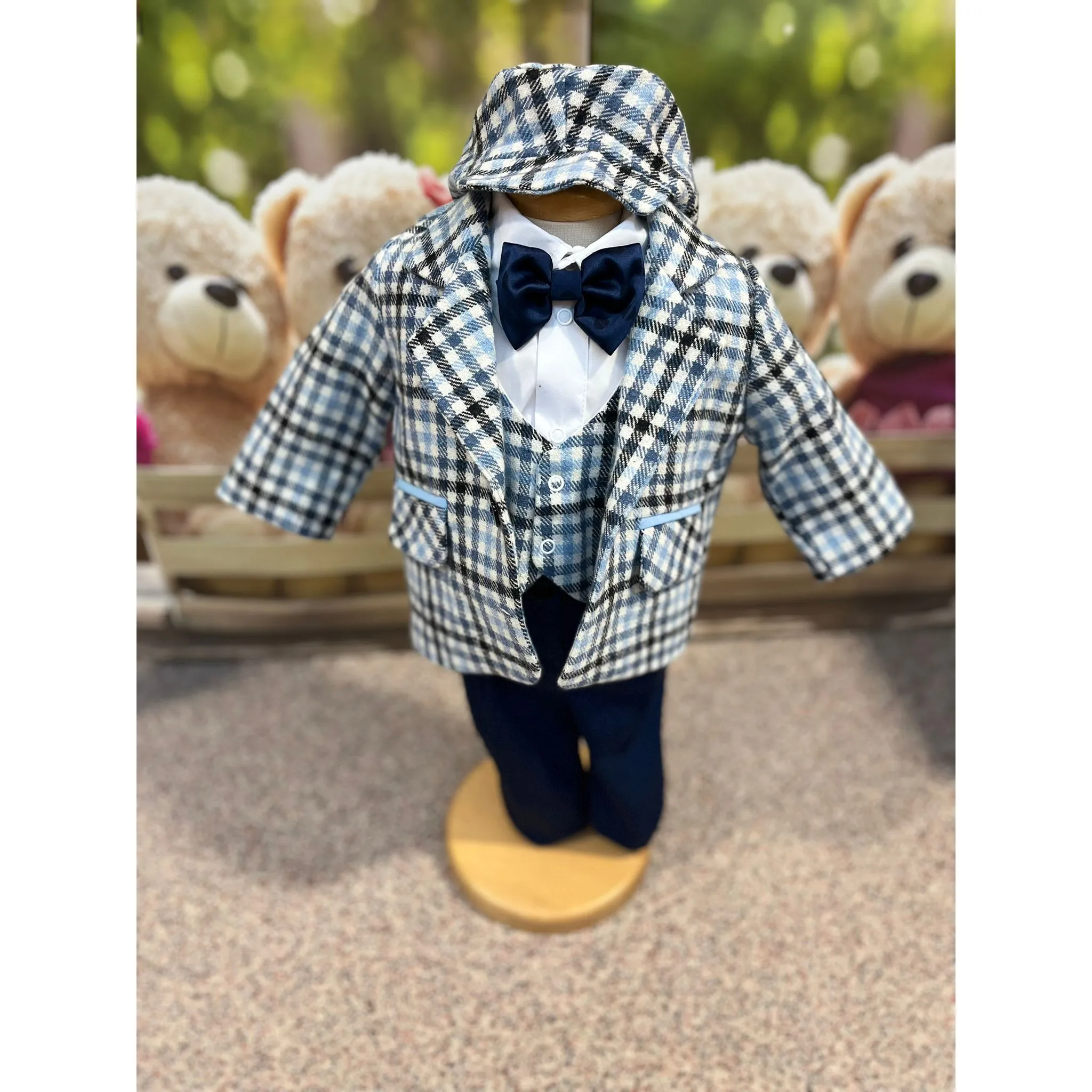 Costum botez 5 piese stofa, carouri albastru - DPH350
