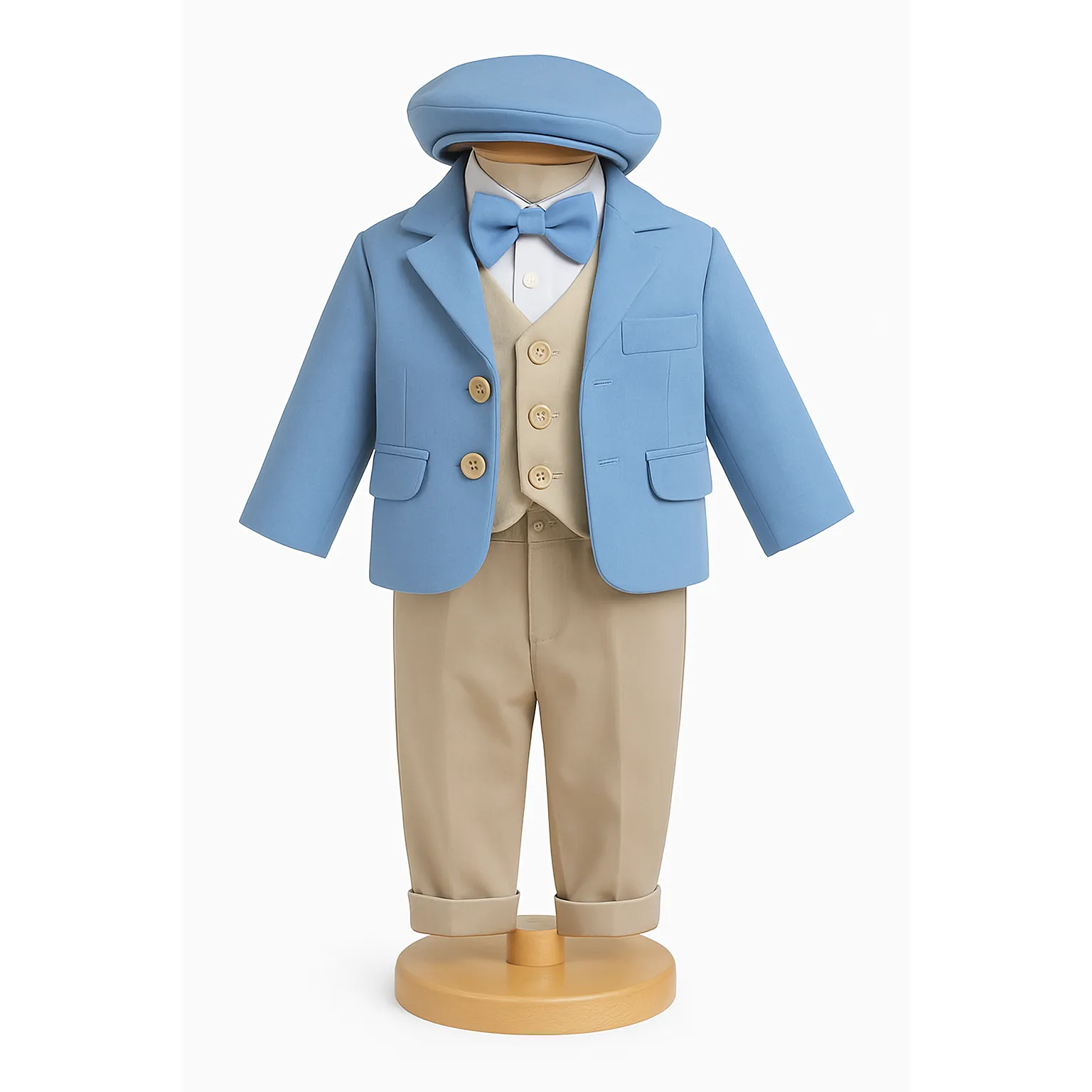 Costumul de botez pentru băieți este realizat cu grijă din materiale de calitate superioară, moi și delicate cu pielea sensibilă a bebelușului. Designul elegant îmbină rafinamentul clasic cu confortul absolut, fiind ideal pentru un eveniment special precum botezul