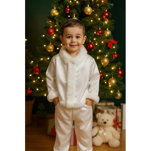 Costum Serbare Copii – Set Moș Crăciun Alb din Satin cu Blăniță