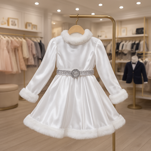 Costum Serbare Fete – Fulg de Nea din Satin Alb cu Blăniță