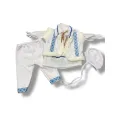 Costumul tradițional pentru băieți, în nuanțe de albastru, cuprinde o cămașă albă din pânză, brodată la guler și mâneci cu motive albastre. Ținuta poate fi completată de o vestă decorată cu modele tradiționale și de opinci sau pantofi simpli. Combinația de alb și albastru sugerează puritate, curaj și eleganță, oferind băieților un aspect deosebit și autentic.