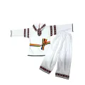 Acest costum tradițional pentru băieți aduce la viață frumusețea și autenticitatea portului popular românesc, fiind ideal pentru sărbători, evenimente culturale sau spectacole școlare. Costumul este confecționat din materiale confortabile, ușor de purtat și rezistente, potrivite pentru pielea delicată a copiilor.