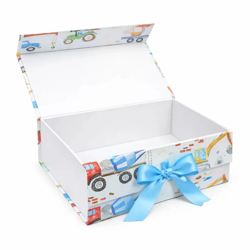 Această cutie cadou veselă, decorată cu ilustrații colorate cu vehicule și utilaje, este perfectă pentru a transforma orice cadou într-o surpriză plină de bucurie. Fundița satinată albastră adaugă un plus de farmec și face ca prezentarea să fie gata de oferit, fără ambalare suplimentară.