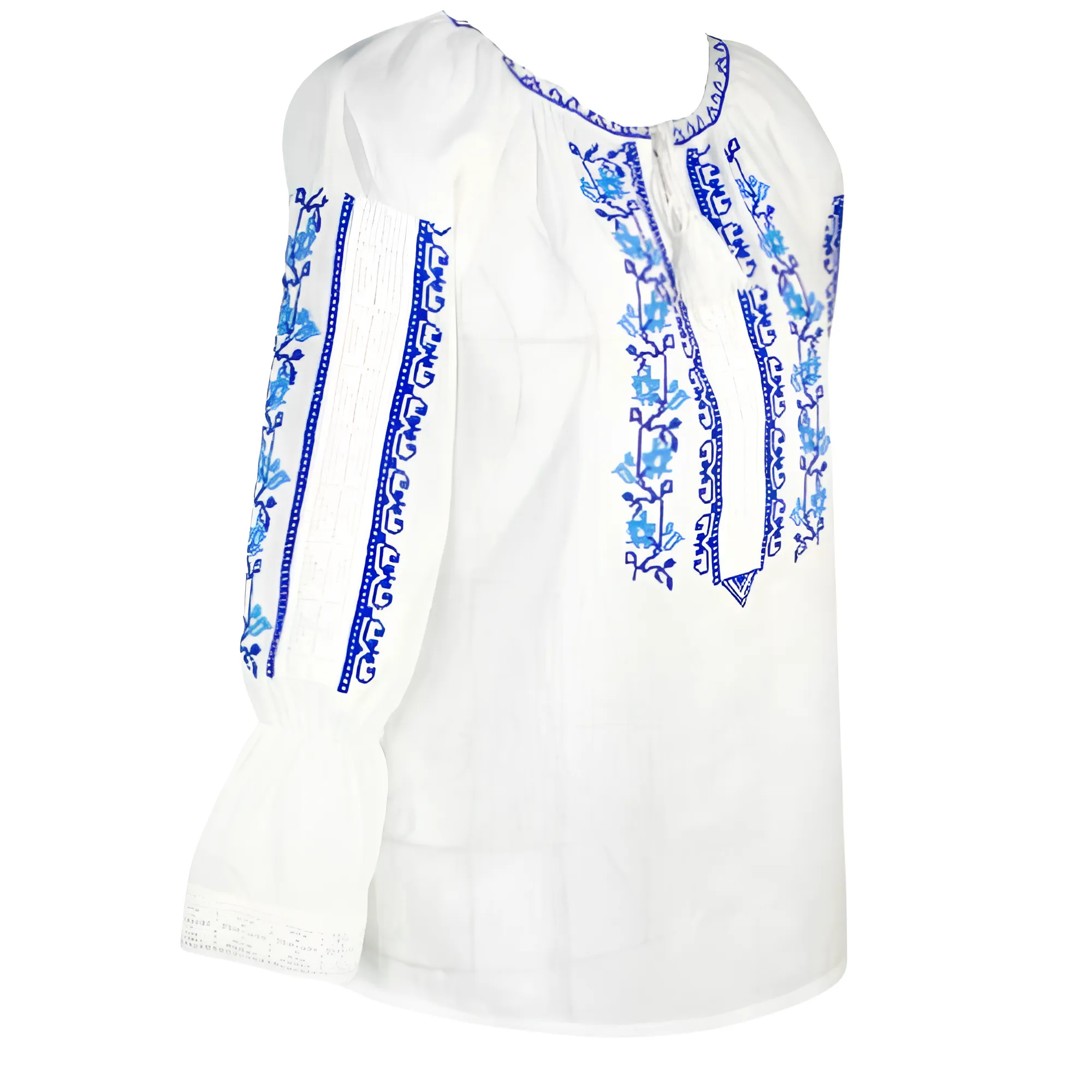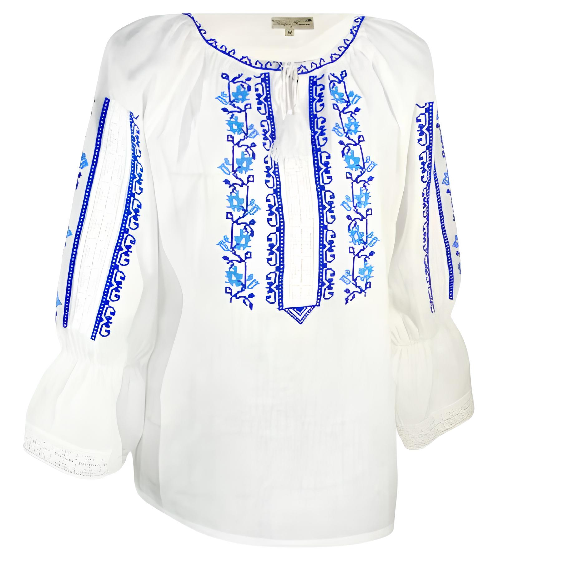 Ie traditionala alba din bumbac cu maneca 3/4 clopot si motiv traditional albastru