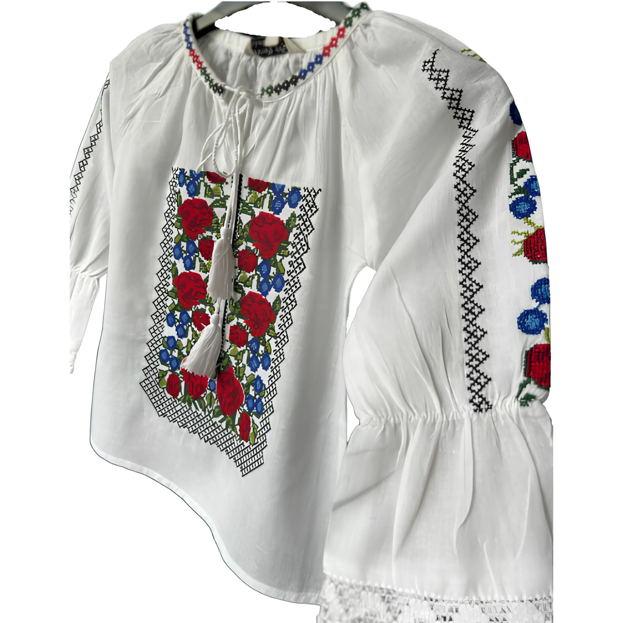 Ie traditionala alba din bumbac cu maneca 3/4 clopot si motiv traditional romanesc