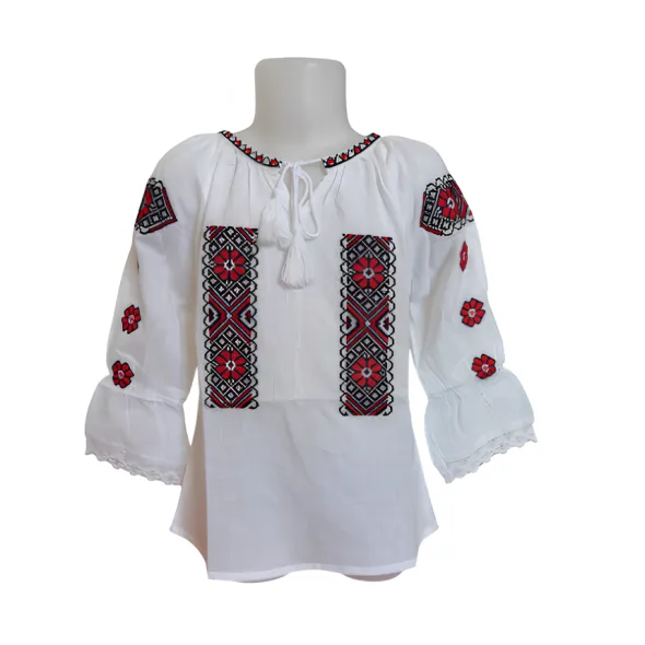 Ie traditionala alba din bumbac cu maneca 3/4 clopot si motiv traditional romanesc