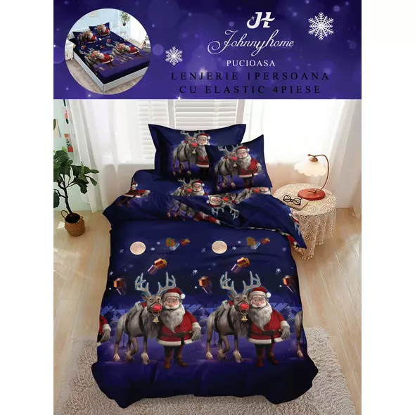 Lenjerie de Pat, Bumbac 100% Finet, 4 piese cu elastic Mos Craciun-
