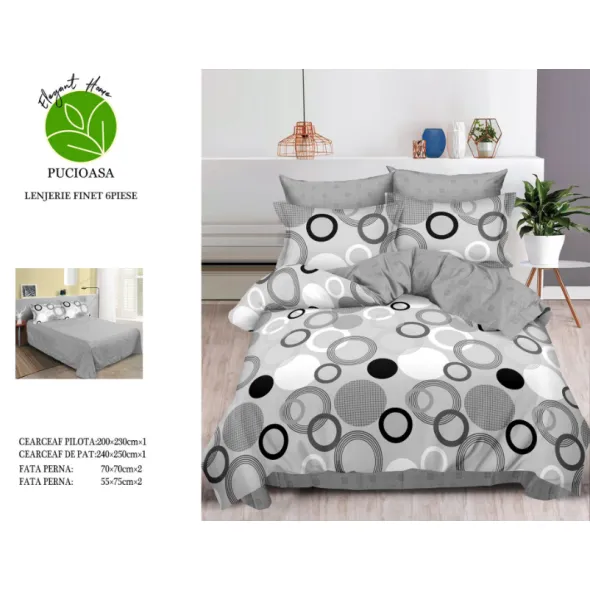 Materialul din care este confectionata lenjeria este bumbac finet, gros, de calitate superioara cu o textura fina, moale si foarte placuta la atingere.