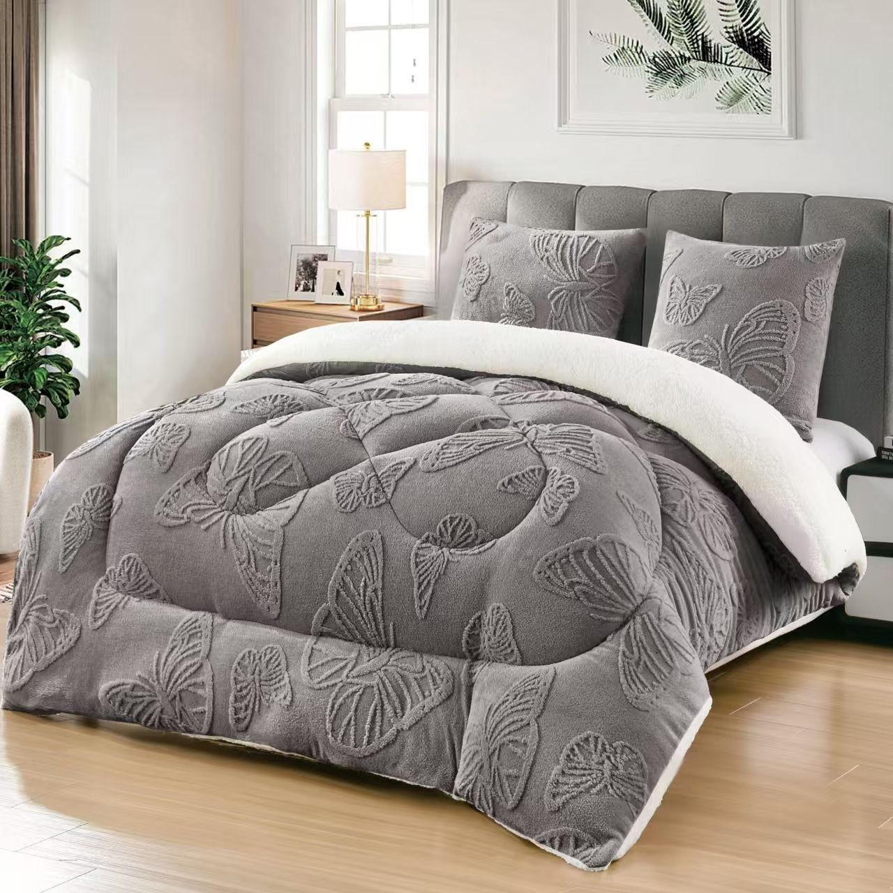 Alege eleganța și confortul absolut cu pilota cu blană 200x230 cm, model fluturi, însoțită de 2 fețe de pernă asortate. Realizată din materiale premium, combina exteriorul catifelat cu interiorul pufos din blăniță, oferind căldură și un somn odihnitor în nopțile reci. Designul cu fluturi adaugă un plus de stil și rafinament dormitorului tău.