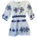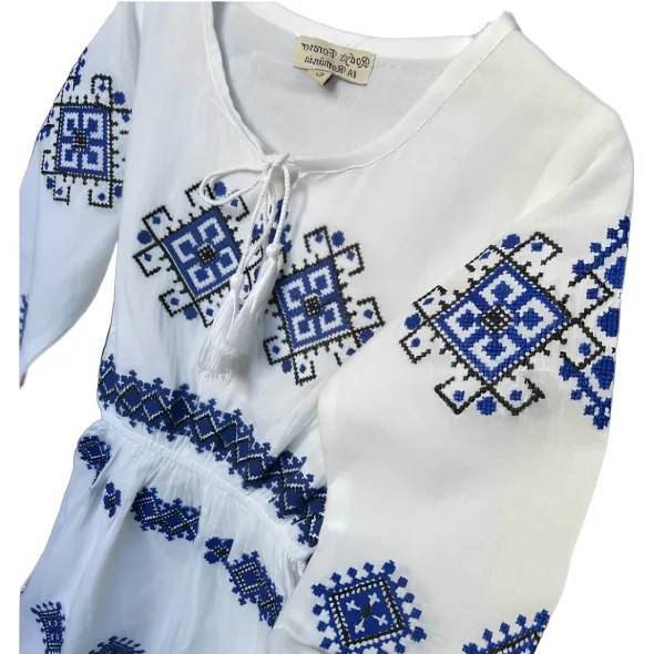 Rochie traditionala alba din bumbac cu maneca 3/4 si motiv traditional albastru