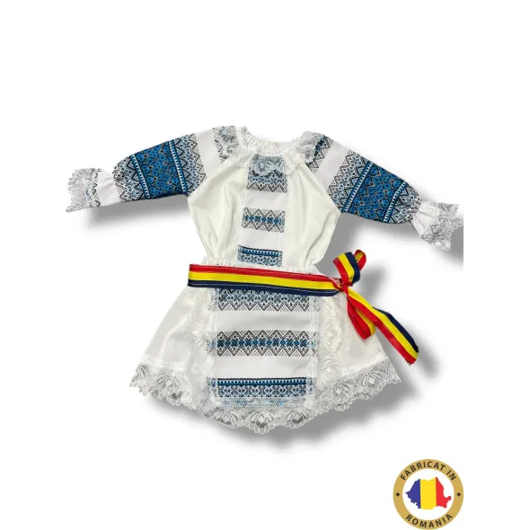 Brâul tricolor adaugă o notă veselă și patriotică, evidențiind mândria față de rădăcinile noastre și frumusețea tradițiilor românești. Materialele folosite sunt delicate și prietenoase cu pielea sensibilă a bebelușilor, asigurând confort maxim și libertate de mișcare. Croiala atentă și proporțiile gândite pentru vârstele de 3, 6 și 12 luni fac ca rochița să fie perfectă pentru micuțele tale prințese.