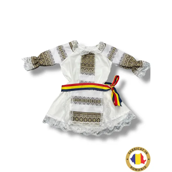 Brâul tricolor adaugă o notă veselă și patriotică, evidențiind mândria față de rădăcinile noastre și frumusețea tradițiilor românești. Materialele folosite sunt delicate și prietenoase cu pielea sensibilă a bebelușilor, asigurând confort maxim și libertate de mișcare. Croiala atentă și proporțiile gândite pentru vârstele de 3, 6 și 12 luni fac ca rochița să fie perfectă pentru micuțele tale prințese.