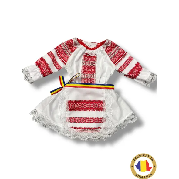 Brâul tricolor adaugă o notă veselă și patriotică, evidențiind mândria față de rădăcinile noastre și frumusețea tradițiilor românești. Materialele folosite sunt delicate și prietenoase cu pielea sensibilă a bebelușilor, asigurând confort maxim și libertate de mișcare. Croiala atentă și proporțiile gândite pentru vârstele de 3, 6 și 12 luni fac ca rochița să fie perfectă pentru micuțele tale prințese.