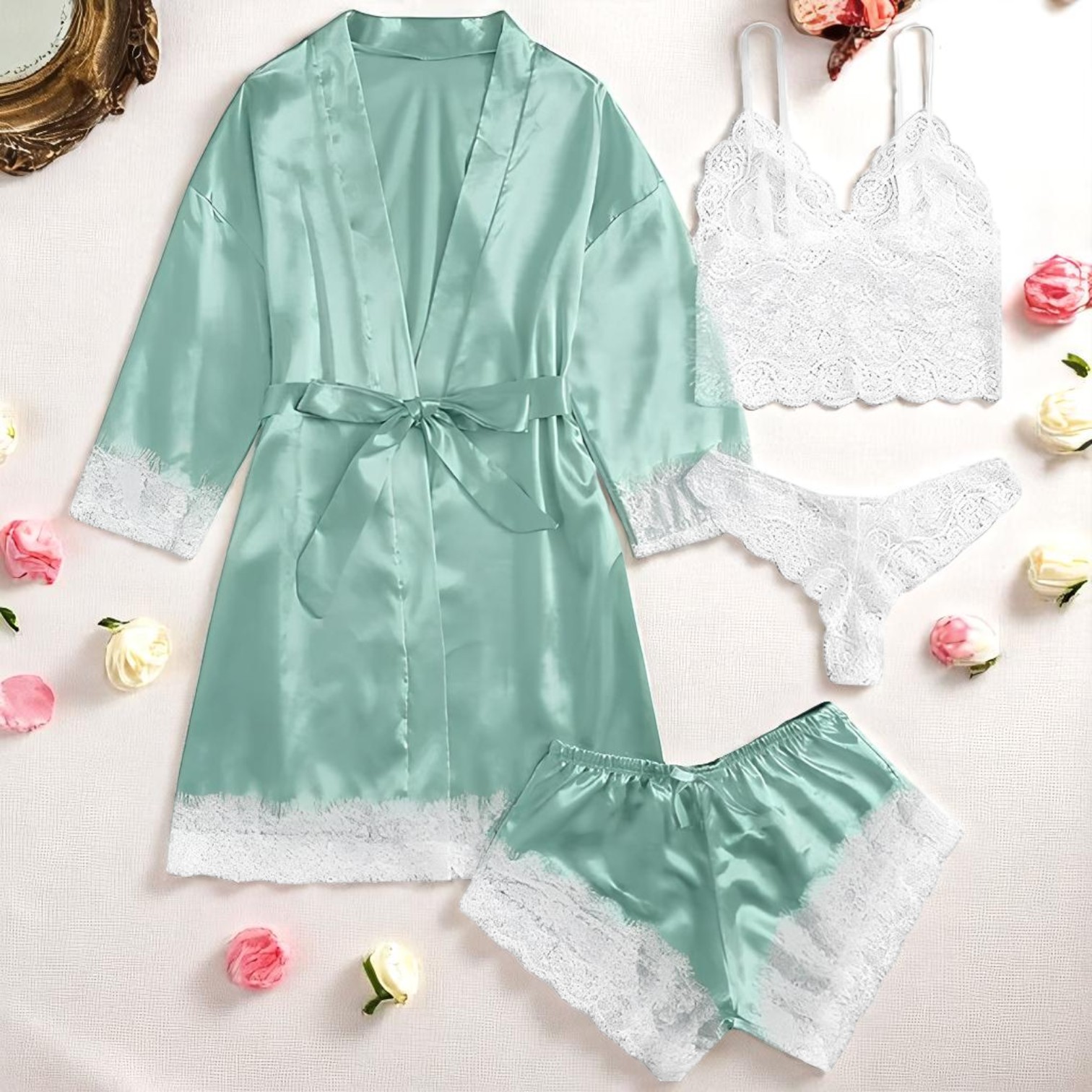 Set Pijamă de Damă 4 Piese din Satin, Culoare Turcoaz – Eleganță Completă pentru Seara Ta de Răsfăț