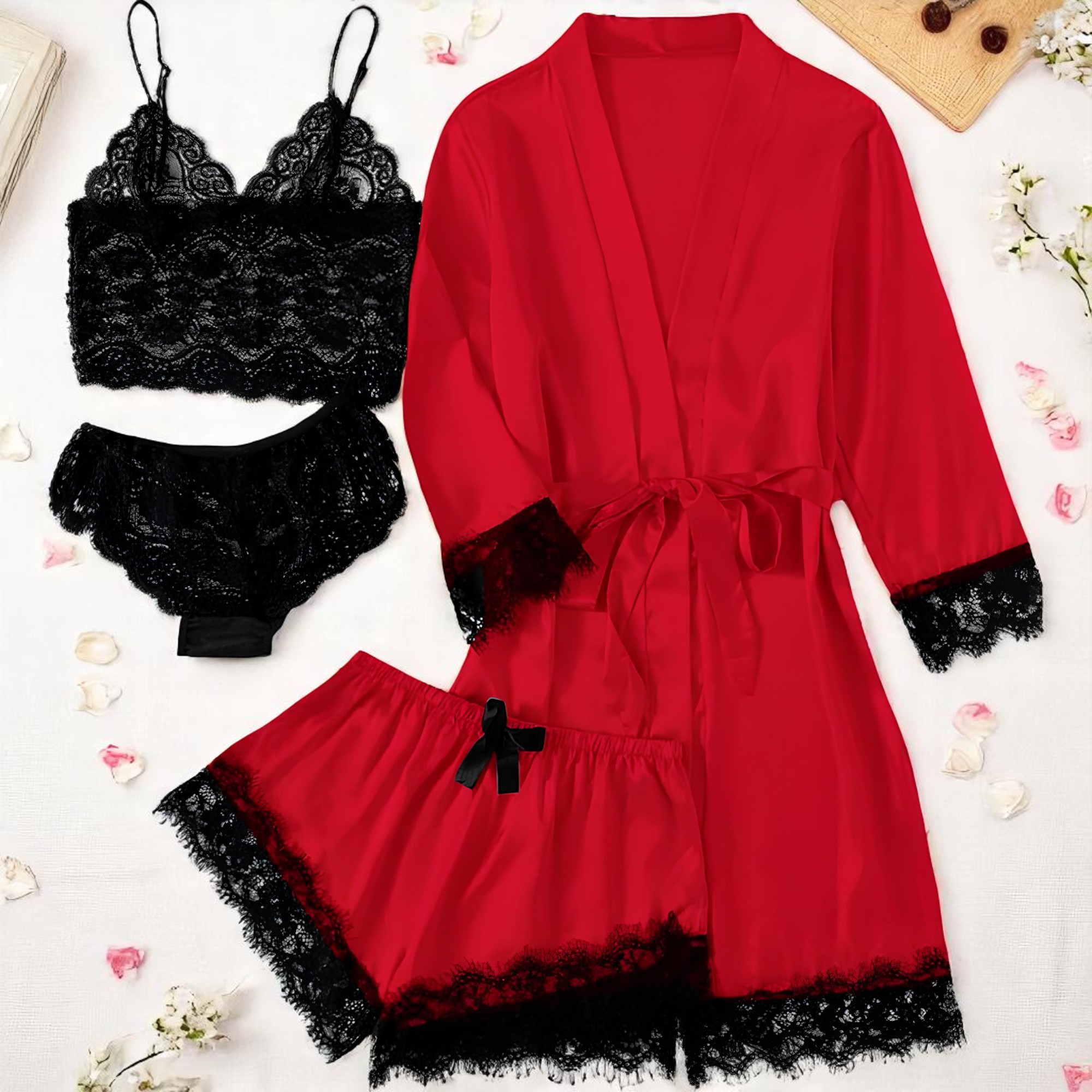 Set Pijamă de Damă 4 Piese din Satin, Culoare Roșu – Pasiune, Eleganță și Răsfăț în Fiecare Detaliu