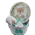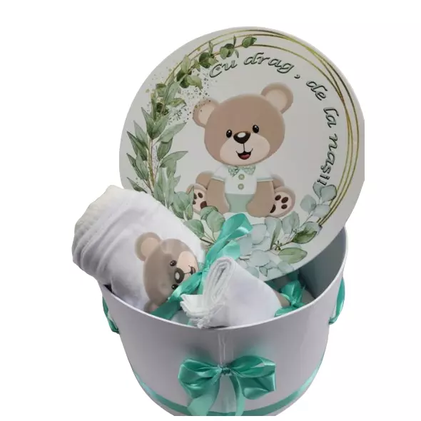 - Prosop pentru bebelus – din material moale deosebit de absorbant,din bumbac de cea mai buna calitate. Prosopul este decorat cu dantela si cu diferite mesaje. Dimensiunea prosopului este de 80 cm x 80 cm, suficient pentru a sterge bebelusul si pentru a-l tine infasurat pe parcursul ceremoniei.