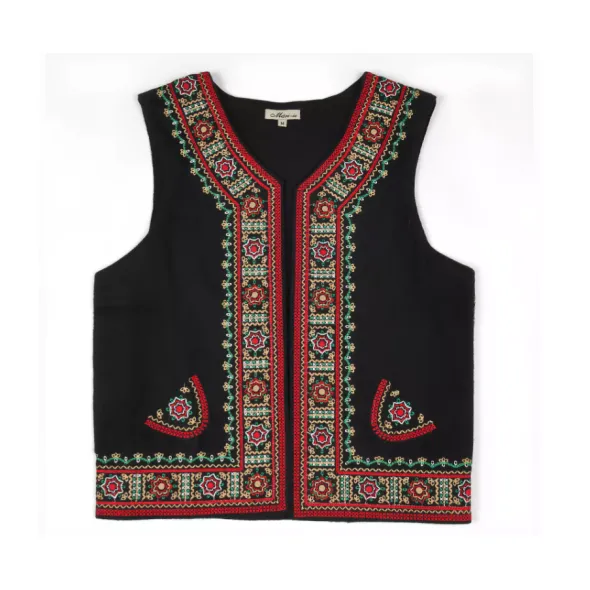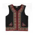 Vesta traditionala neagra din stofa cu motiv floral rosu. Modelul de vesta ofera lejeritate la purtare, intrucat nu prezinta inchidere